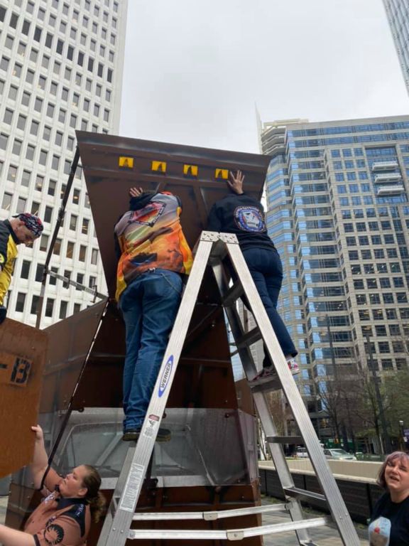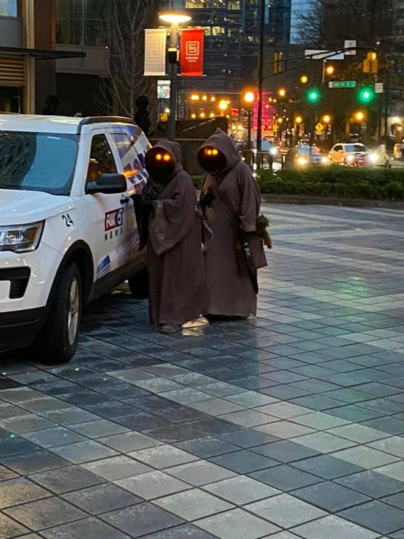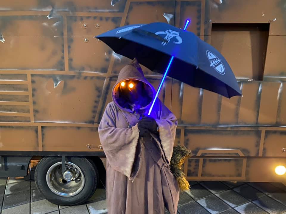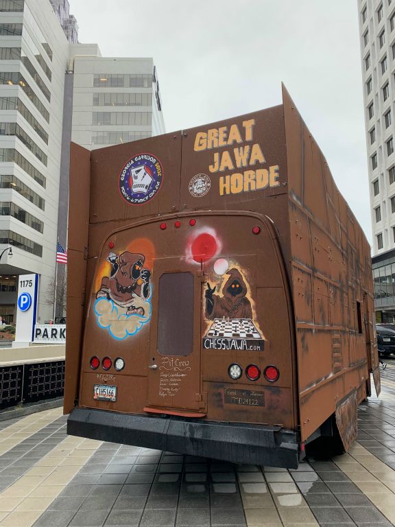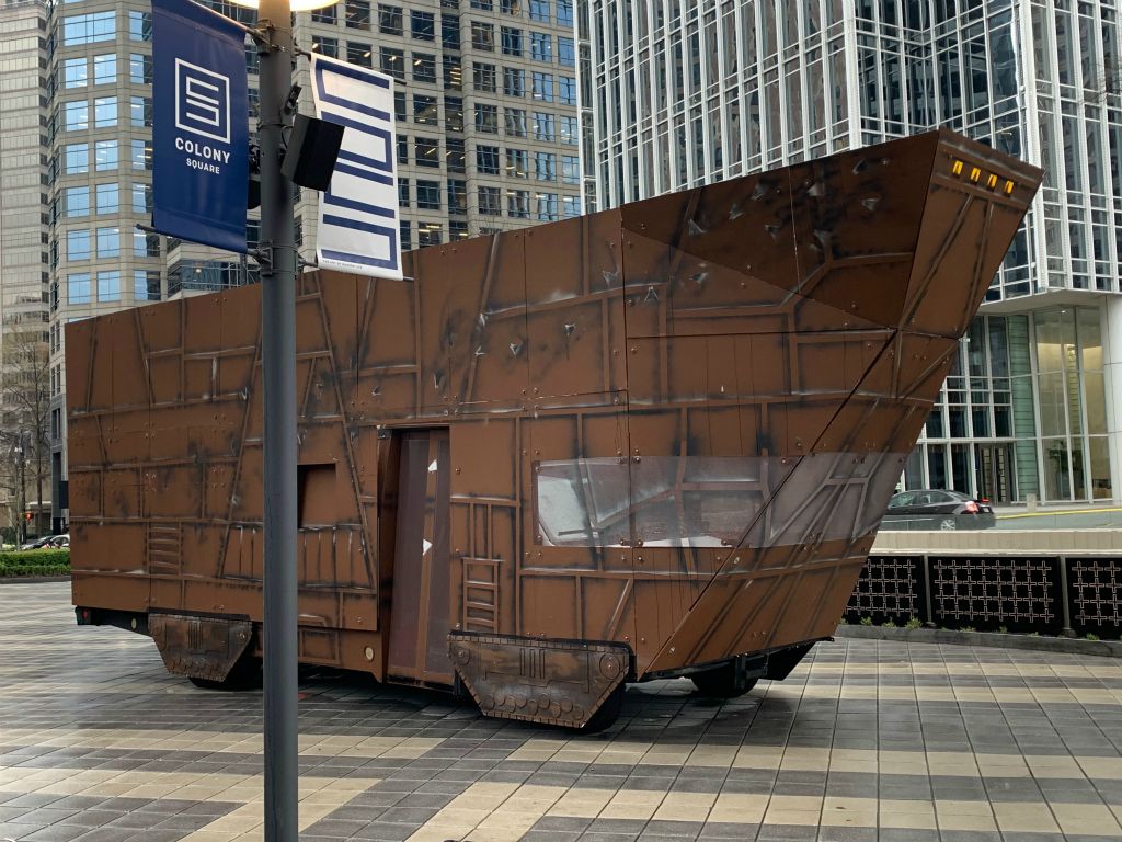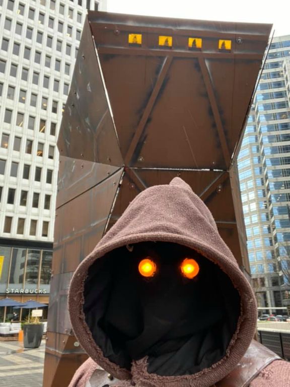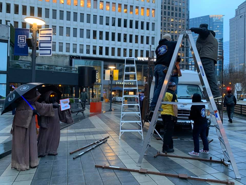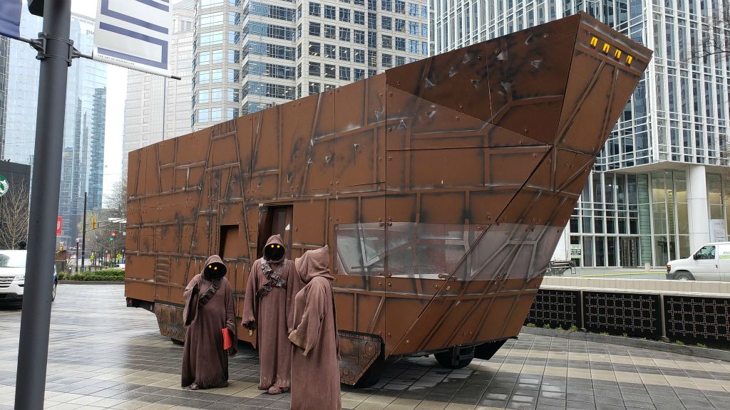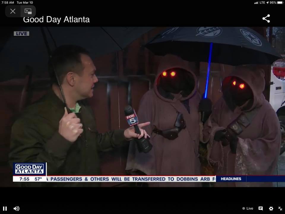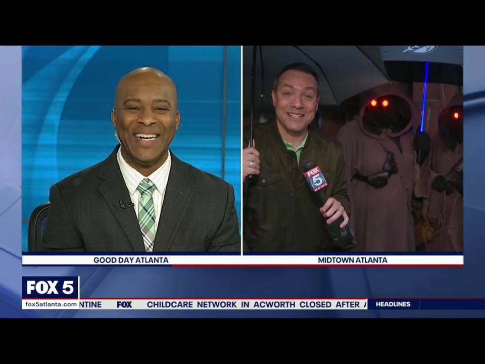 HOWEVER, days prior to the scheduled parade date, the Sandcrawler was invited to appear on Good Day Atlanta, a local morning show. There was a bit of rain, so our screen time was limited and they didn't manage to get us back on-air after the build was complete, but Sandy made an impression nonetheless. The news anchor tweeted his praise after the event, and Sandy was also noticed on Reddit! Below we have the aggregated Sandcrawler video from the event and a gallery of pictures.